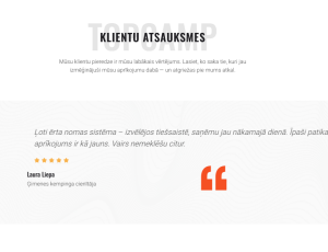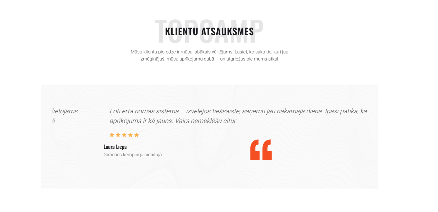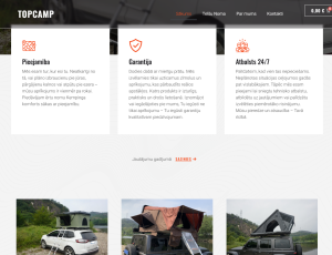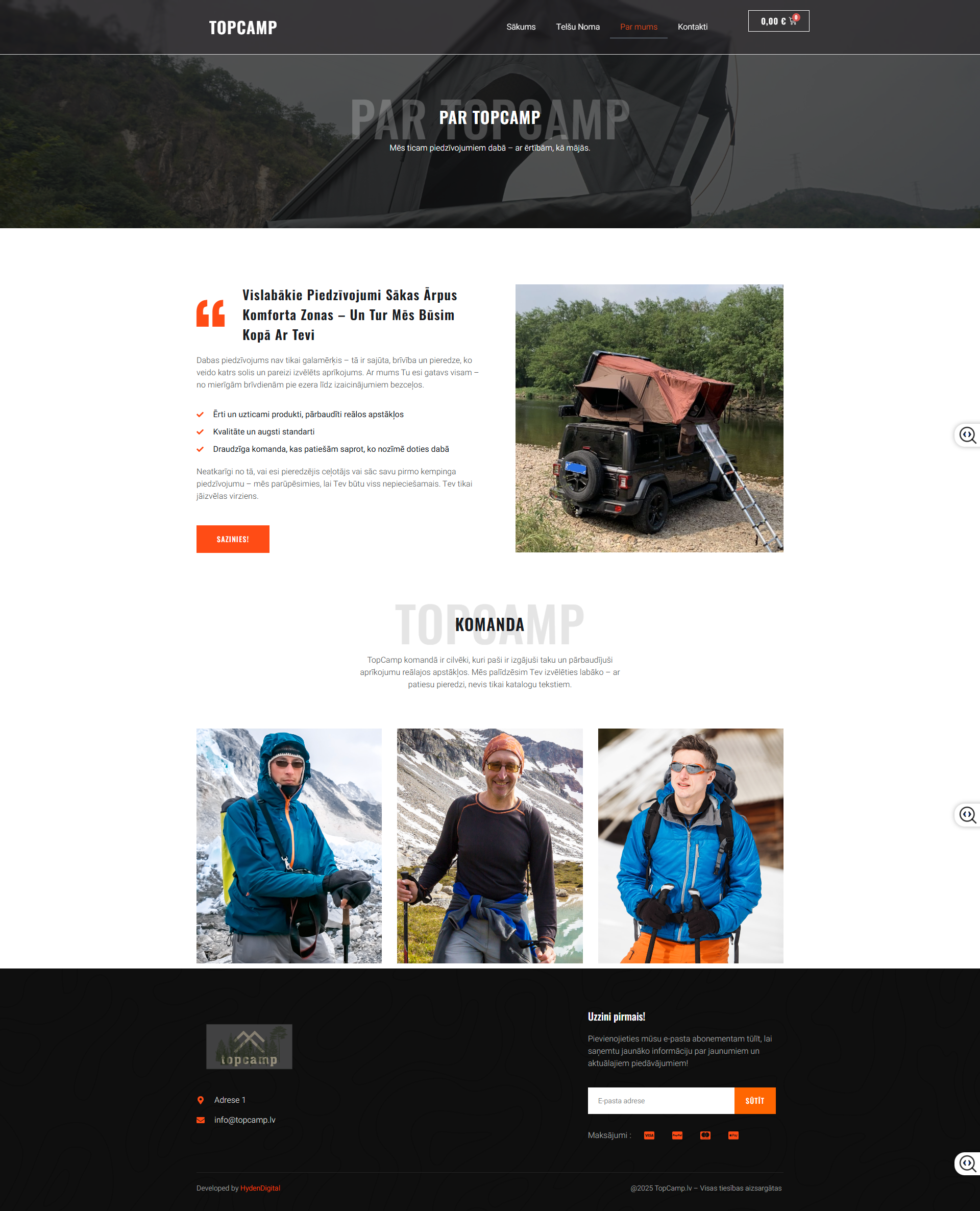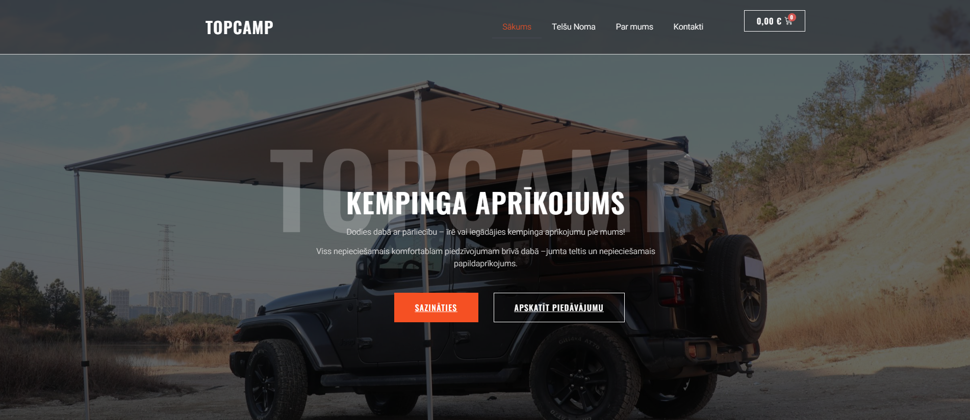 TopCamp ir moderna kempinga aprīkojuma nomas un pārdošanas platforma, kas piedāvā kvalitatīvu telšu, guļammaisu un citu ceļojuma inventāra izvēli ar ērtu rezervāciju un piegādi visā Latvijā. Mājaslapa izstrādāta, lai nodrošinātu lietotājam draudzīgu pieredzi, ātru piekļuvi produktiem un 24/7 atbalstu piedzīvojumiem brīvā dabā.